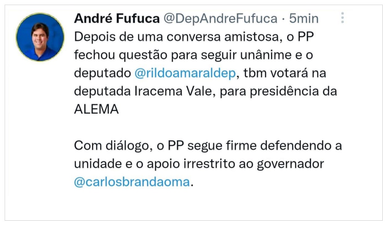 “Depois de uma conversa amistosa, o PP fechou questão para seguir unânime e o deputado Rildo Amaral, também votará na deputada Iracema Vale, para presidência da ALEMA Com diálogo, o PP segue firme defendendo a unidade e o apoio irrestrito ao governador Carlos Brandão”, anunciou André.