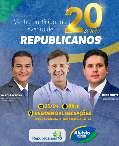 O evento será conduzido pelo presidente do Republicanos no Maranhão, deputado federal Aluísio Mendes, e contará com as presenças do presidente nacional, deputado Marcos Pereira e do presidente da Câmara dos Deputados, Hugo Motta, além de senadores, deputados e grandes lideranças do Republicanos em todo o Brasil.