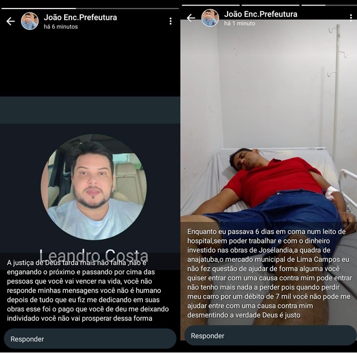 Em outro post, João tornou pública uma foto dele em um leito de hospital na qual diz que passou seis dias em coma. Ele reclama que ficou sem trabalhar e sem dinheiro, porque seus recursos estavam investidos nas obras, como uma Quadra em Anajatuba. “Não fez questão de ajudar de forma alguma. Não tenho mais nada a perder, pois quando pedir meu carro por um débito de R$ 7 mil você [Leandro] não pode me ajudar”, escreveu.
