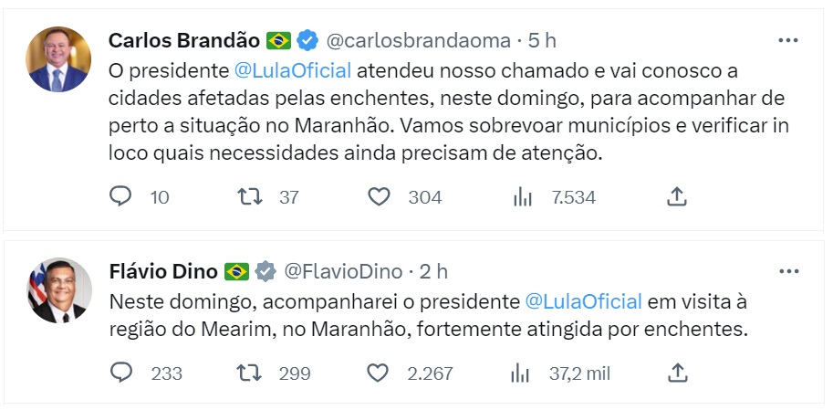 Por meio das redes sociais o governador do Maranhão, Carlos Brandão e o ministro da Justiça e Segurança Pública, Flávio Dino, ambos do PSB, anunciaram que o presidente Luiz Inácio Lula da Silva fará um sobrevoo na manhã deste domingo (9) na região de Trizidela do Vale, atingida por chuvas no Maranhão.