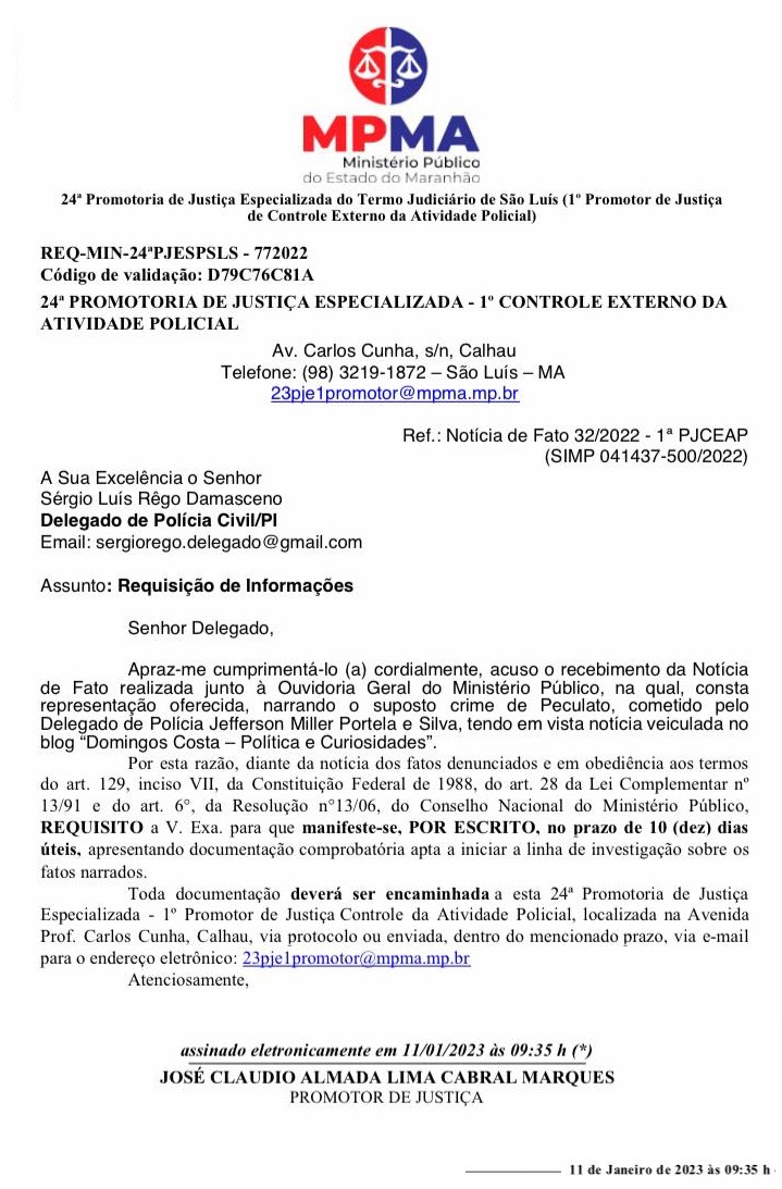 Desde o dia 11 de janeiro de 2023, José Cláudio Almada Lima Cabral Marques, 1º Promotor de Justiça de Controle Externo de Atividade Policial, da 24ª Promotoria de Justiça Especializada do Termo Judiciário de São Luís, começou a investigar o delegado da Polícia Civil do Maranhão, Jefferson Portela, ex-secretário de Segurança Pública do Estado (SSP-MA).