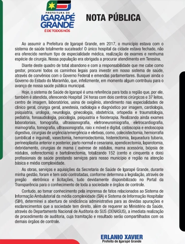 Na nota, Erlânio que é o braço direito do senador Weverton Rocha (PDT), sustenta que não sabia de nada, exalta seus feitos na saúde da cidade e, acreditem, diz que irá abrir uma sindicância e auditoria na saúde do município de Igarapé Grande na qual ele próprio é o chefe do Executivo.