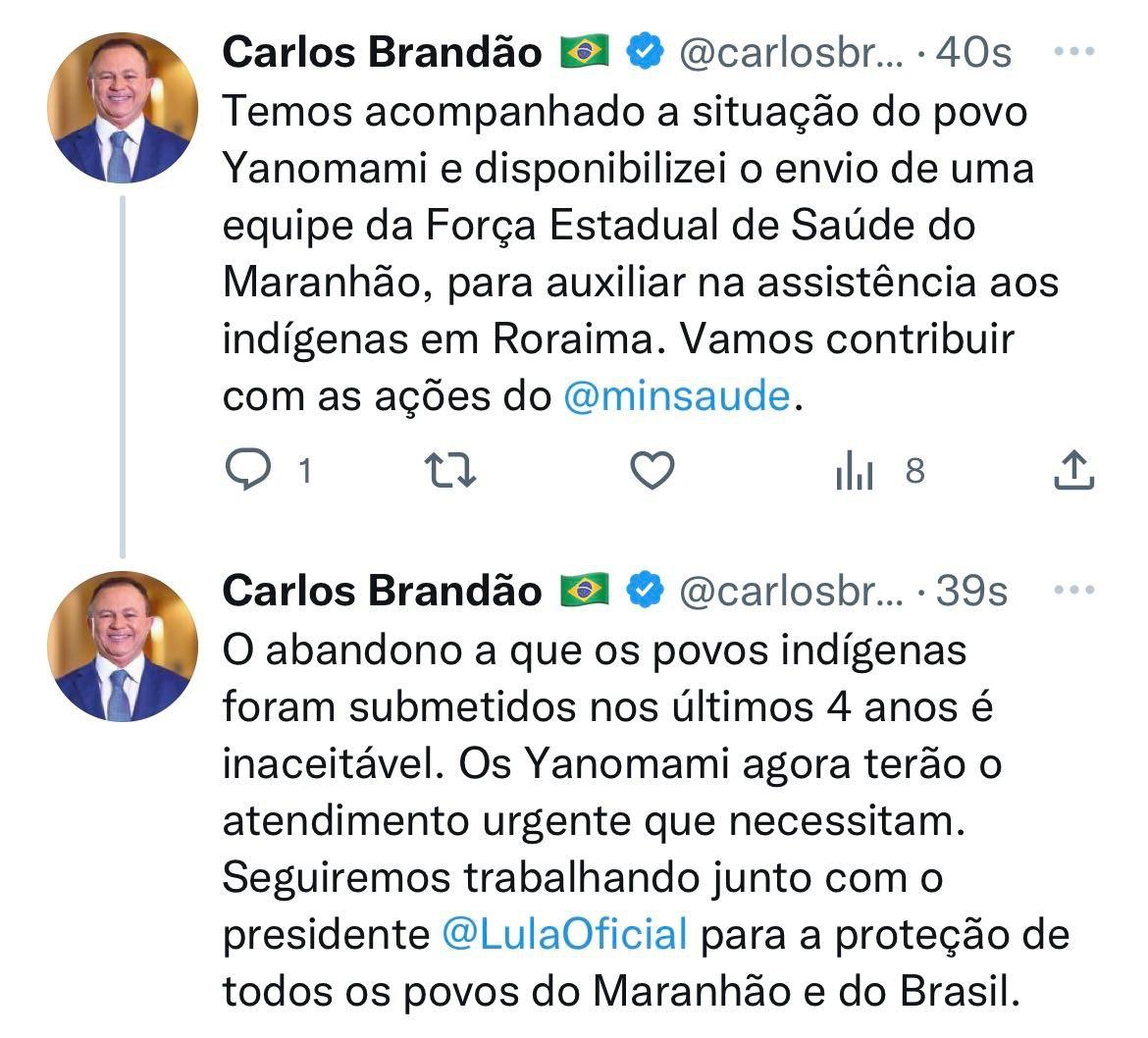 “Por determinação do governador Carlos Brandão, colocamos à disposição do Ministério da Saúde os profissionais da Fesma. Nossa equipe tem experiência no acompanhamento de povos indígenas no Maranhão e poderá auxiliar na assistência ao povo Yanomami, em Roraima. Cuidar das pessoas é a nossa missão”, postou o secretário em sua rede social.