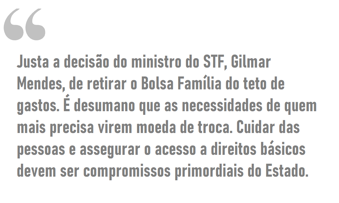 – Do governador Carlos Brandão (PSB) por meio de suas redes sociais, ao se manifesar sobre a decisão do ministro do STF (Supremo Tribunal Federal), Gilmar Mendes, em retirar o Bolsa Família do teto de gastos. Com a decisão, o governo federal poderá no próximo ano abrir créditos extraordinário e essas despesas não se incluem nos limites de teto de gasto, o que vai aliviar a pressão do Centrão sob Lula na votação da PEC da Transição.