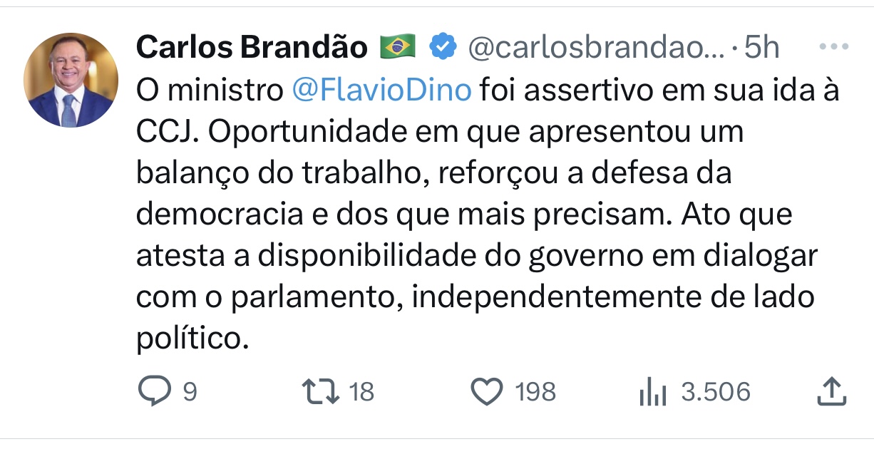 “O ministro Flávio Dino foi assertivo em sua ida à CCJ. Oportunidade em que apresentou um balanço do trabalho, reforçou a defesa da democracia e dos que mais precisam. Ato que atesta a disponibilidade do governo em dialogar com o parlamento, independentemente de lado político”, disse Brandão.
