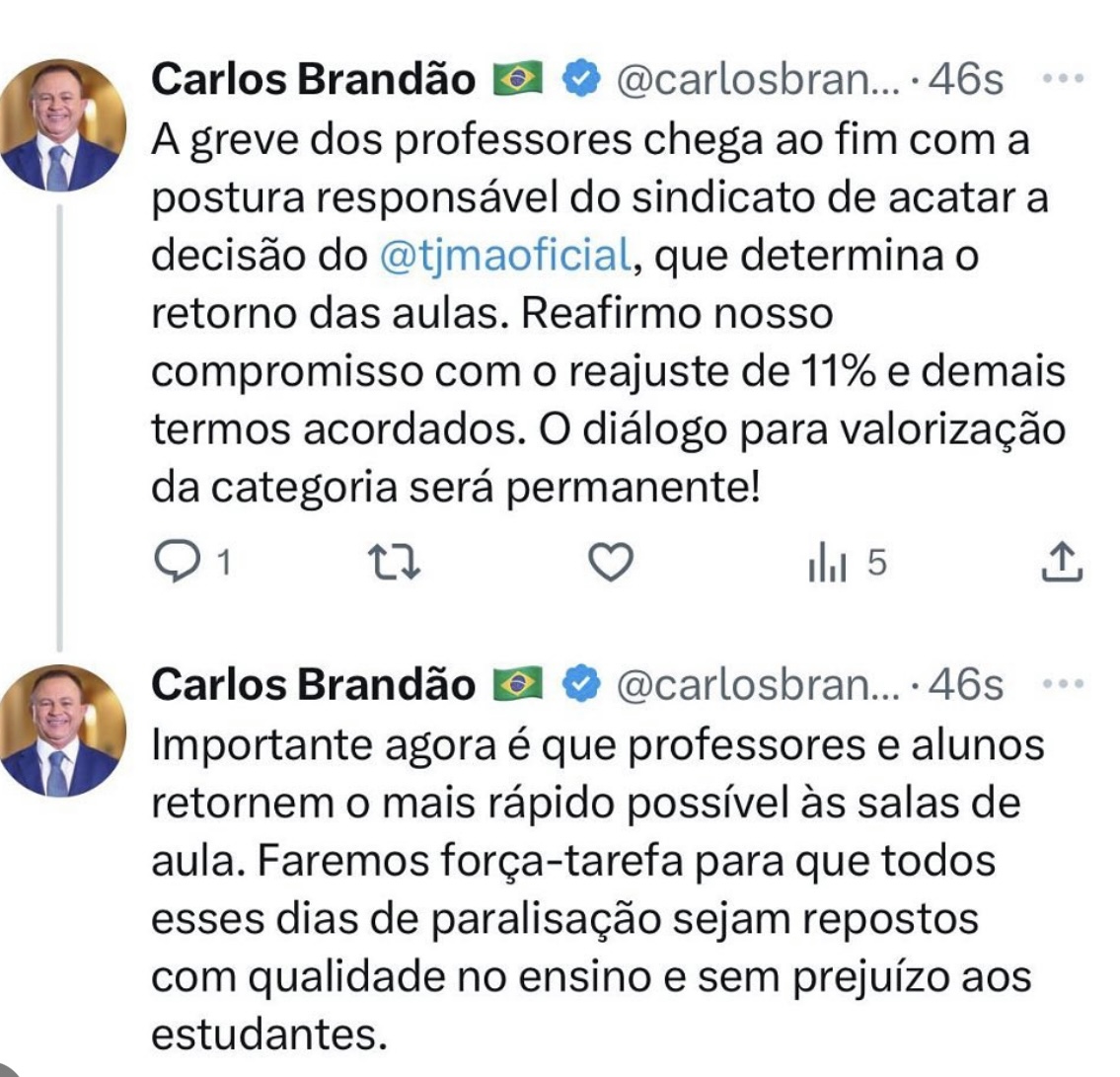 Nesta sexta-feira (31) governador do Maranhão, Carlos Brandão (PSB), comemorou o fim da greve dos professores da rede estadual de ensino.