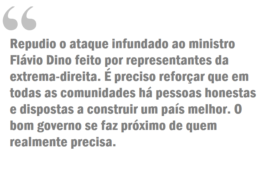 – Do Governador do Maranhão, Carlos Brandão (PSB) nesta quinta-feira (16) sobre aos comentários do deputado Eduardo Bolsonaro acerca da visita do Ministro Flávio Dino visita no Complexo da Maré, no Rio de Janeiro, na qual insinuou aproximação do ministro com o crime organizado e se mostrou indignado com o fato do ministro conversar com moradores da favela.