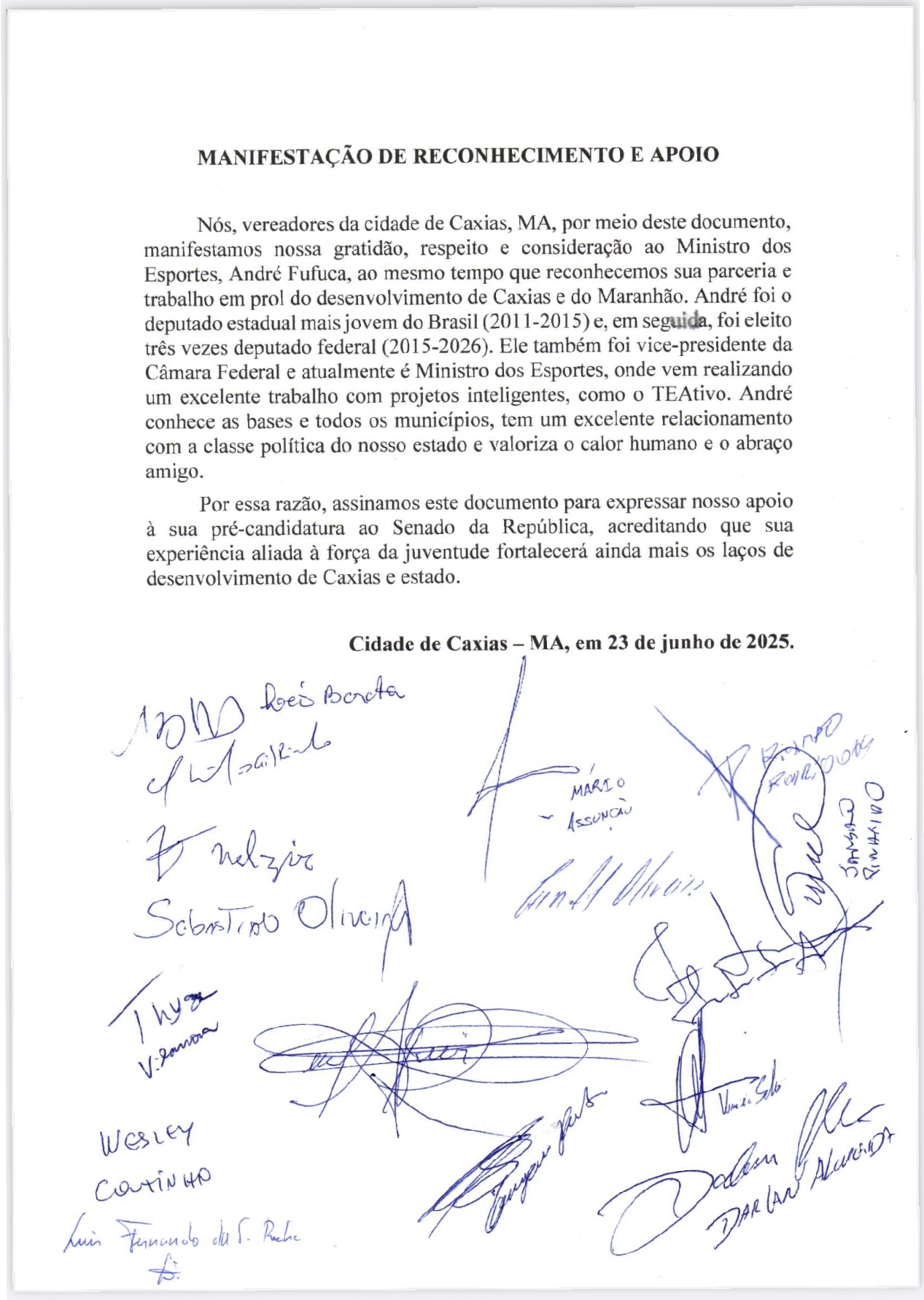 O documento de apoio foi assinado hoje pelos vereadores da cidade, que destacaram a trajetória política de Fufuca e sua atuação em favor do desenvolvimento de Caxias e do Maranhão. O texto ressalta o compromisso do ministro com as bases municipais e sua sensibilidade em ouvir e atender às demandas da população.