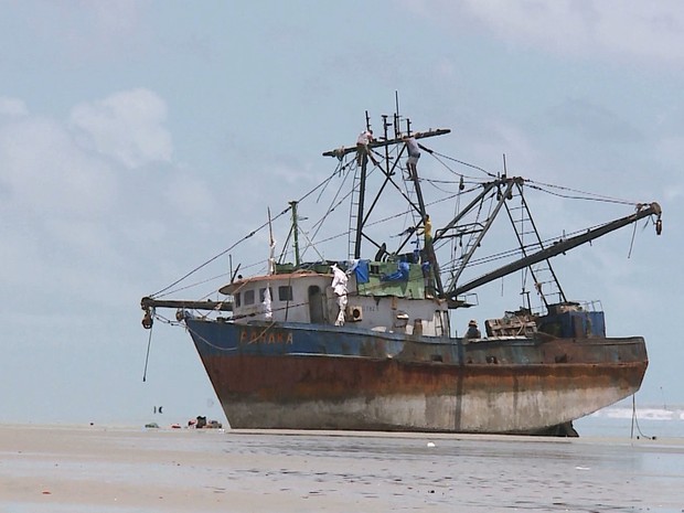 O barco de pesca tem aproximadamente 20 metros de comprimento e encalhou em uma praia considerada quase deserta.