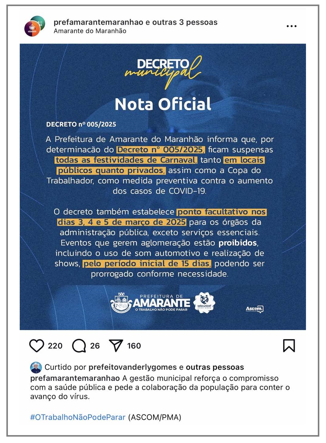 Contudo, três anos após, o prefeito Vanderly Gomes Miranda encontrou na covid-19 o motivo para não realizar o carnaval na cidade de Amarante do Maranhão.