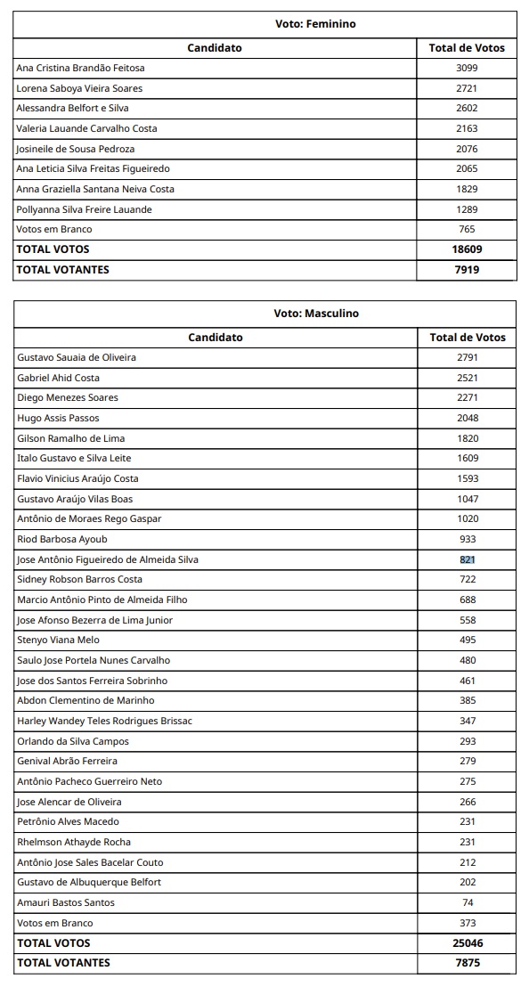A eleição levou em consideração, segundo regras do Edital, igualdade de gênero (mesmo número de homens e mulheres) e cota racial, foram eleitos 12 nomes.