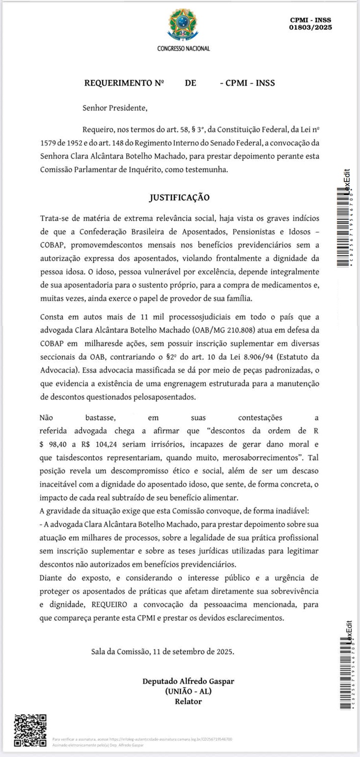 O deputado federal Alfredo Gaspar (União-AL), relator da Comissão Parlamentar Mista de Inquérito que investiga esquema criminoso de desvio de recursos de aposentados e pensionistas via Instituto Nacional do Seguro Social (INSS), apresentou requerimento solicitando a convocação da advogada mineira Clara Alcântara Botelho Machado para prestar depoimento.