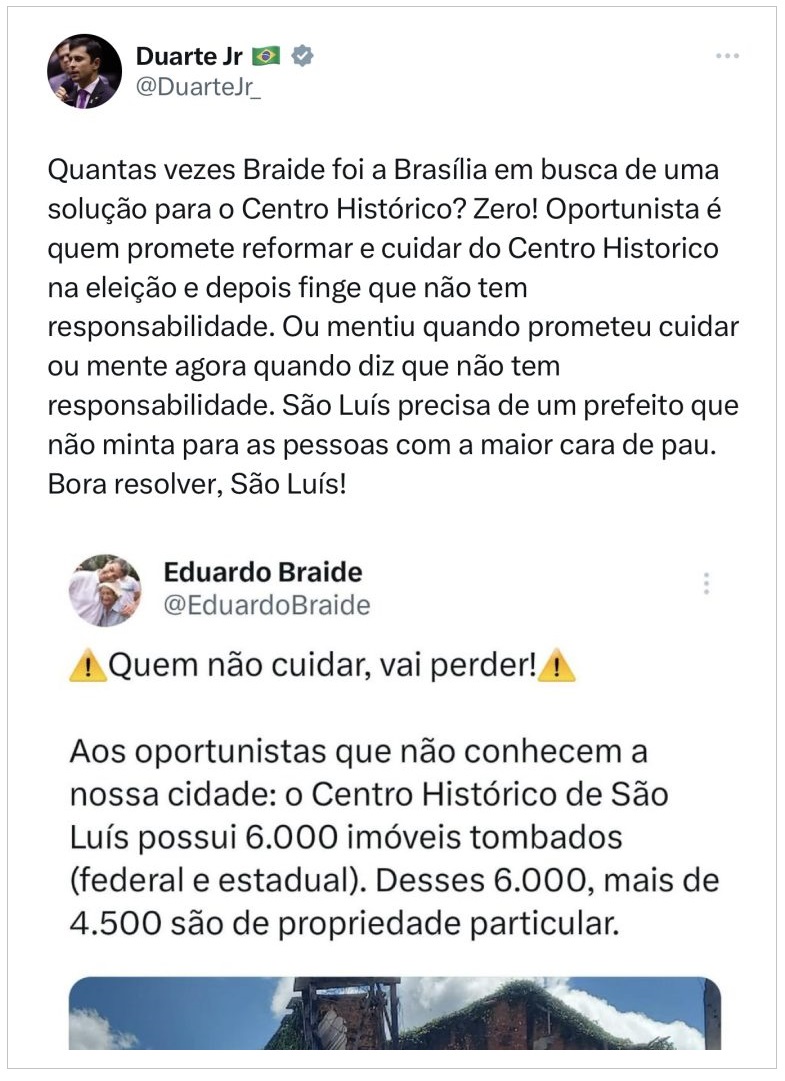 O prefeito Eduardo Braide (PSD) mostrou publicamente seu desconforto, após ser cobrado pelo deputado federal Duarte (PSB), sobre promessas não cumpridas em relação ao Centro Histórico.