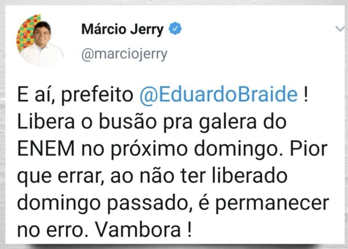 “E aí, prefeito @EduardoBraide! Libera o busão pra galera do ENEM no próximo domingo! Pior que errar, ao não ter liberado domingo passado, é permanecer no erro. Vambora!” Escreveu o parlamentar.