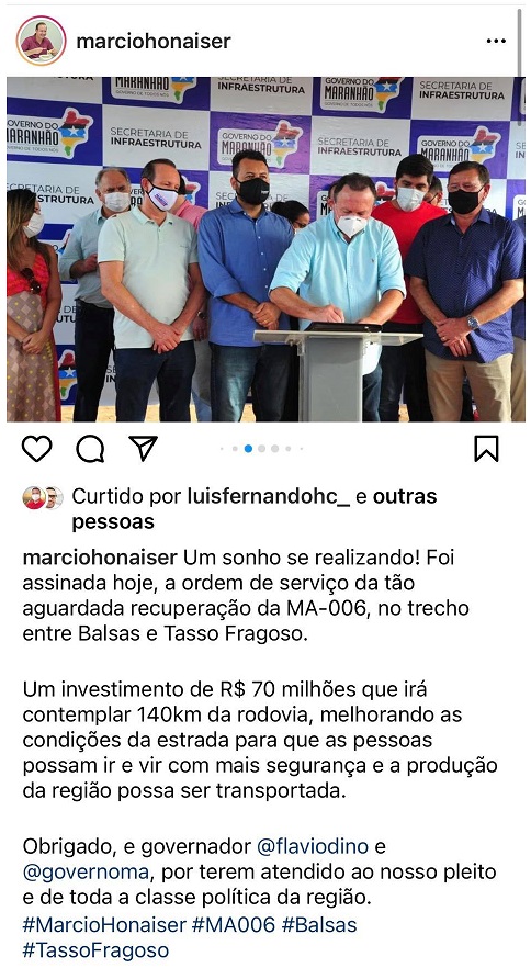 Nesta quinta-feira (29) o  vice-governador Carlos Brandão e o secretário de Estado da Infraestrutura, Clayton Noleto assinaram a ordem de serviço da MA-006, entre Balsas e Tasso Fragoso, que receberá trabalhos que representam praticamente a reconstrução da rodovia.