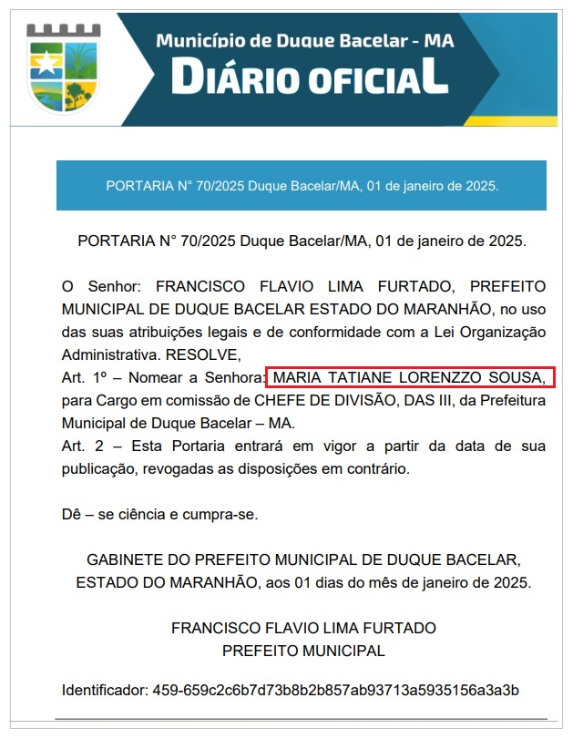 Três dias após, em 3 de janeiro de 2025, o prefeito Flávio Furtado (PDT) designou Maria Tatiane Lorenzzo Sousa para ser AGENTE DE CONTRATAÇÃO DA PREFEITURA DE DUQUE BACELAR. Daí em diante, ela começa assinar diversos processos licitatórios.