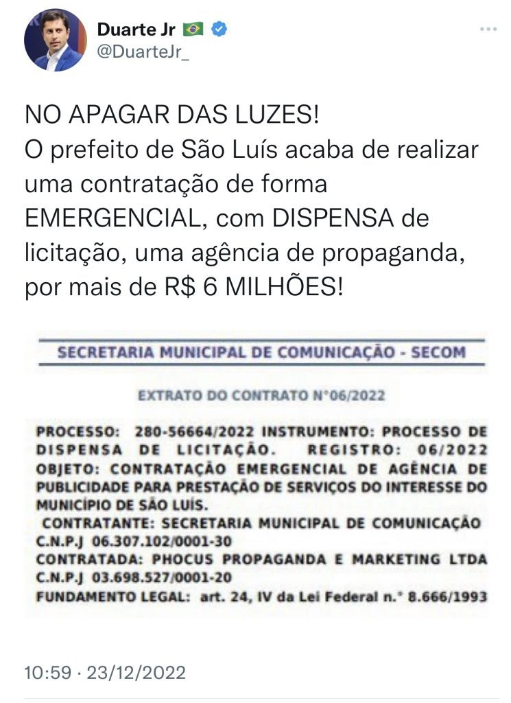 “NO APAGAR DAS LUZES! O prefeito de São Luís acaba de realizar uma contratação de forma EMERGENCIAL, com DISPENSA de licitação, uma agência de propaganda, por mais de R$ 6 MILHÕES!” Denúncia o deputado.