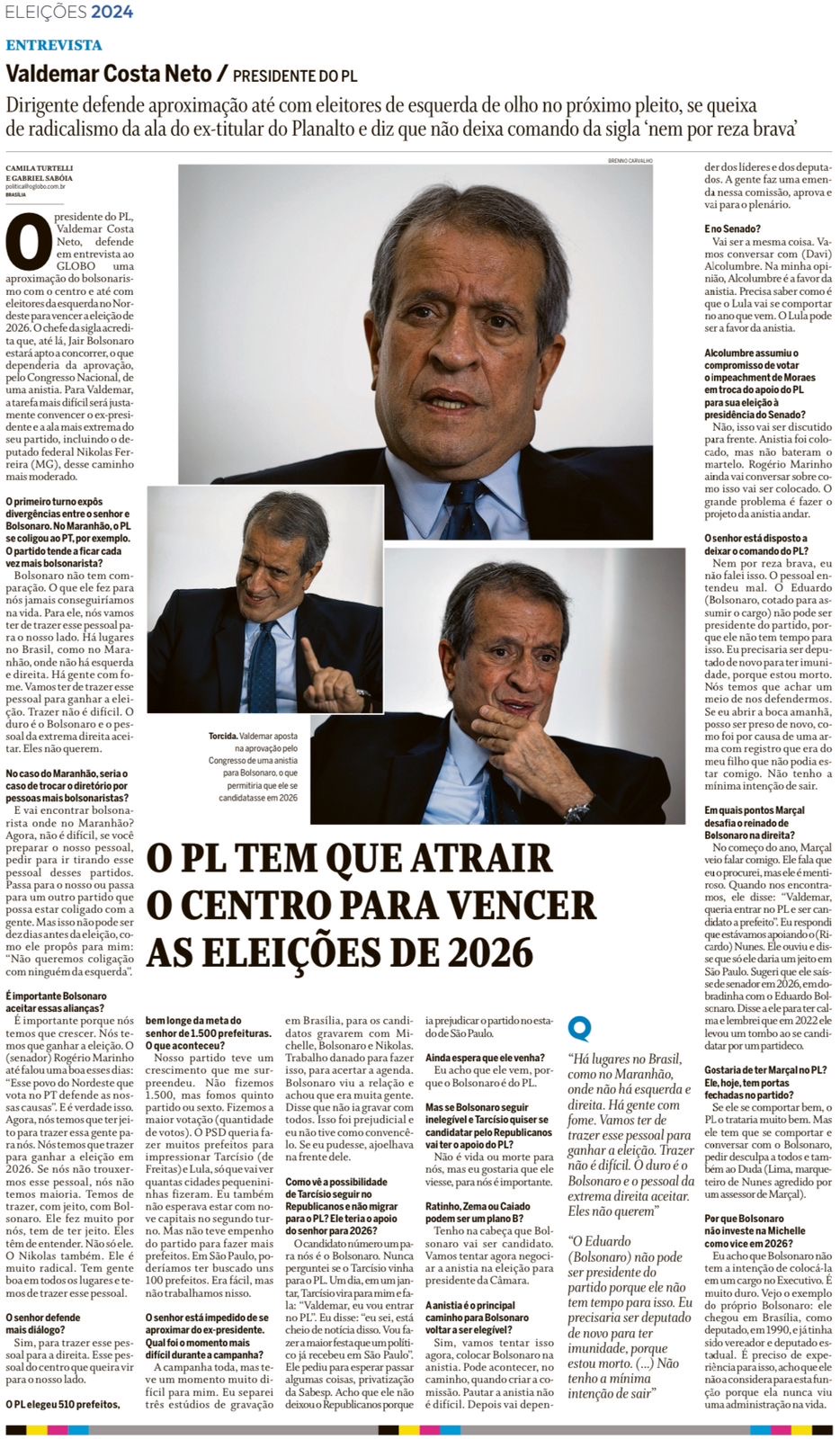 Em entrevista ao jornal O Globo, Valdemar Costa Neto, presidente nacional do Partido Liberal (PL), trouxe à tona divergências internas e traçou os rumos da sigla para as eleições de 2026. Em meio a discussões sobre o futuro do bolsonarismo, Costa Neto não poupou críticas à radicalização do partido em alguns estados, destacando que, no Maranhão, a realidade política exige uma aproximação com o eleitorado de centro e esquerda.