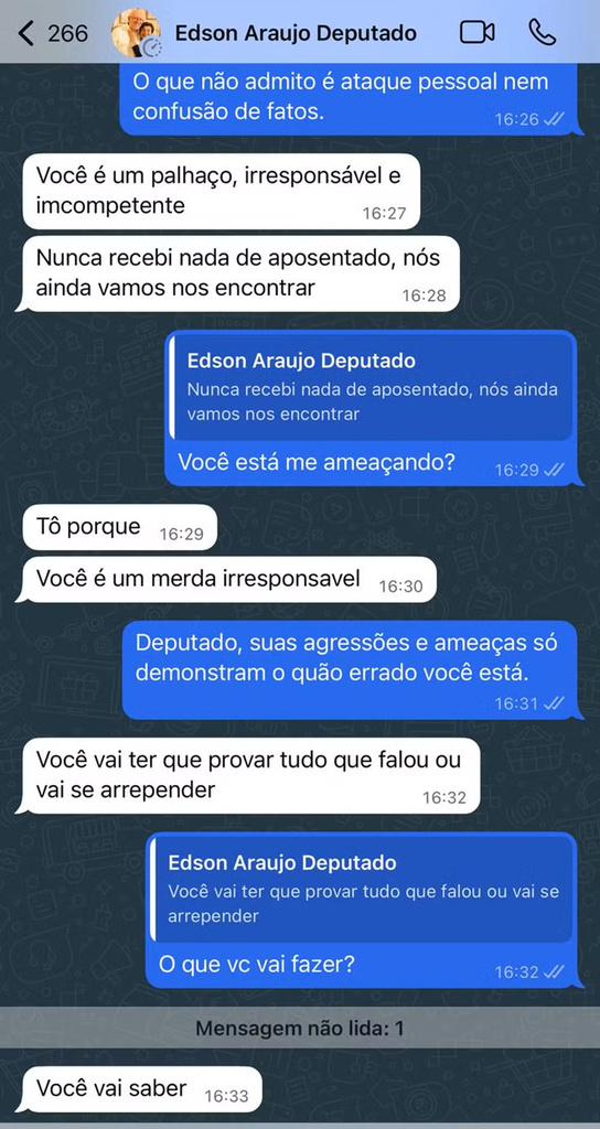 Conforme prints divulgados nas redes sociais pelo próprio Duarte, Edson Araújo diz que ainda “iria se encontrar com Duarte”. O deputado federal perguntou se aquilo era uma ameaça, e Edson afirmou que sim. Em seguida, o vice-presidente da CPMI do INSS perguntou o que Araújo iria fazer, ao que ele respondeu: “Você vai saber”.