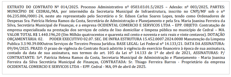 No extrato do contrato nº 014/2025, publicado no diário oficial do município, chama atenção o fato de que a empresa vencedora do Processo Administrativo nº 0503.03.01.5/2025 na prefeitura cedralense por meio da Ata de Registro de Preços nº 003/2025 possui como atividade econômica principal “construção de edifícios”.