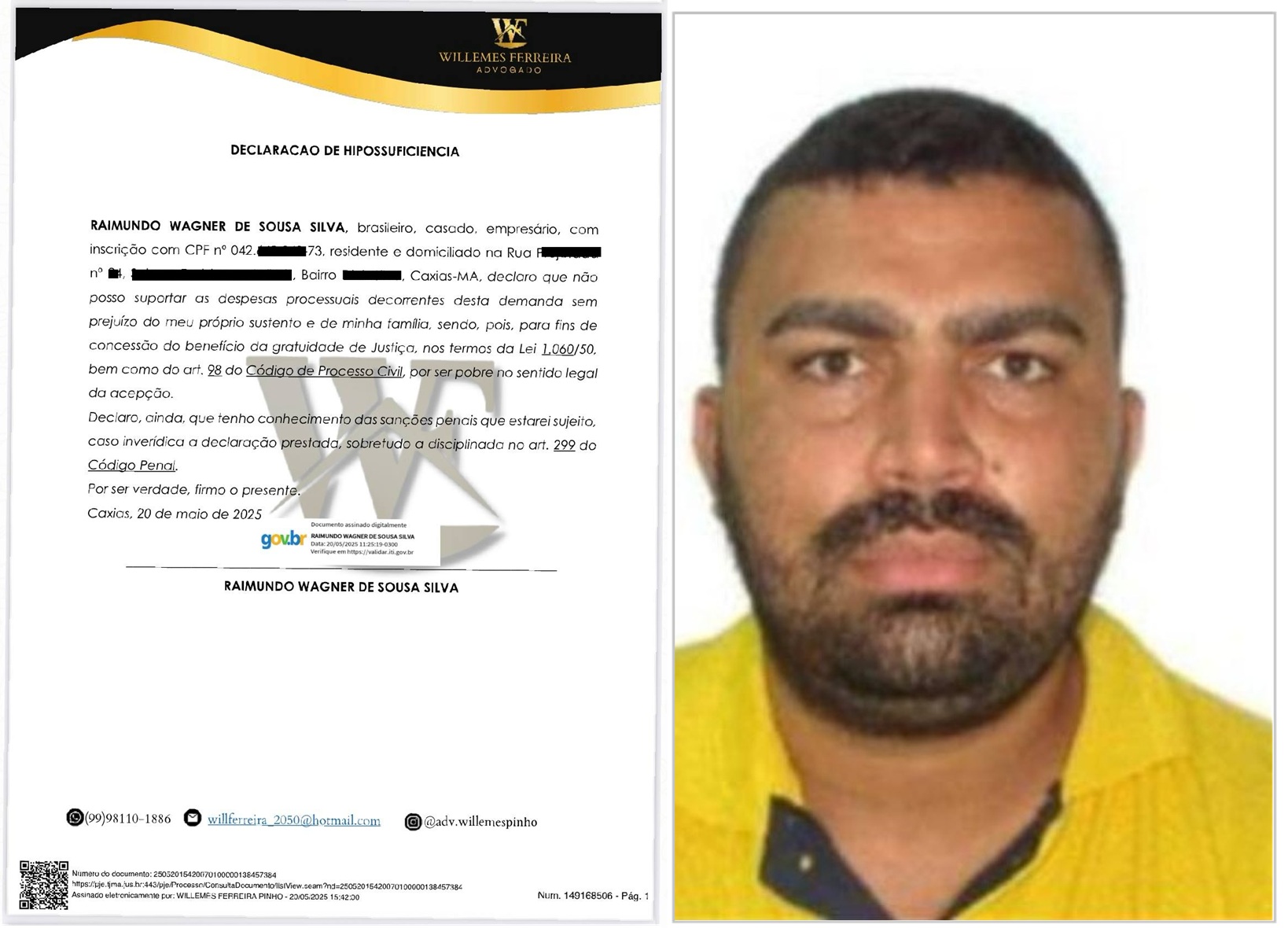 Raimundo Wagner, natural de Caxias, assinou uma declaração de hipossuficiência, também conhecida como “declaração de pobreza” – documento que permite a uma pessoa comprovar que não tem condições financeiras para arcar com as despesas processuais.