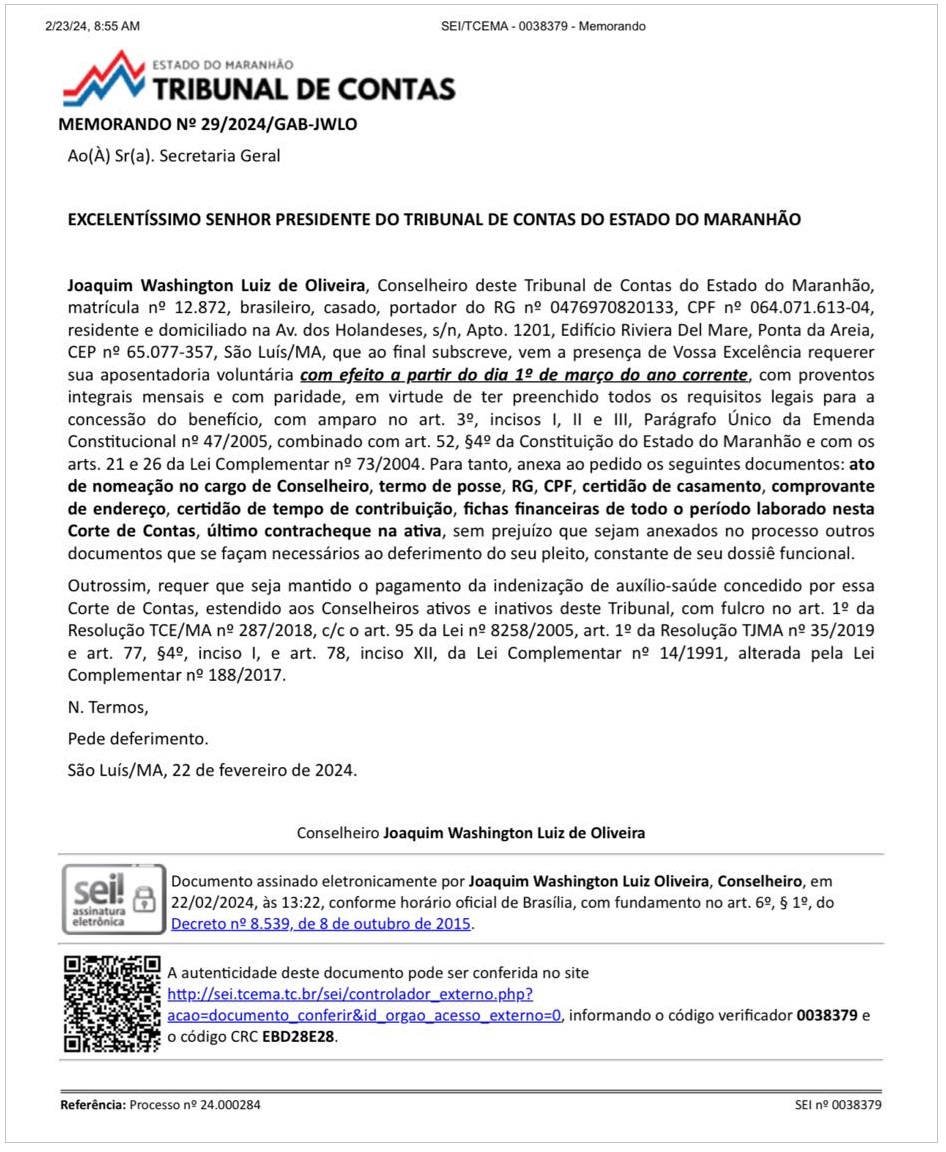 O Blog do Domingos Costa mais uma vez sai na frente e publica em primeira mão o documento no qual o “petista” conselheiro do Tribunal de Contas do Estado do Maranhão (TCE/MA), Joaquim Washington Luiz de Oliveira, conhecido no meio político como “Macaxeira”, protocolou nesta quinta-feira (22) solicitando a antecipação de sua aposentadoria na Corte de Contas.