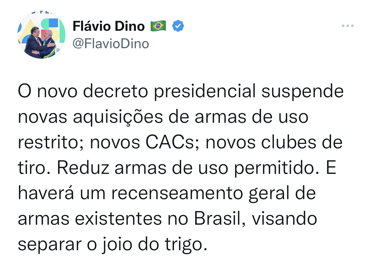 O ministro destacou que vai promover um levantamento do uso de armas no país. “O novo decreto presidencial suspende novas aquisições de armas de uso restrito; novos CACs; novos clubes de tiro. Reduz armas de uso permitido. E haverá um recenseamento geral de armas existentes no Brasil, visando separar o joio do trigo”, disse.