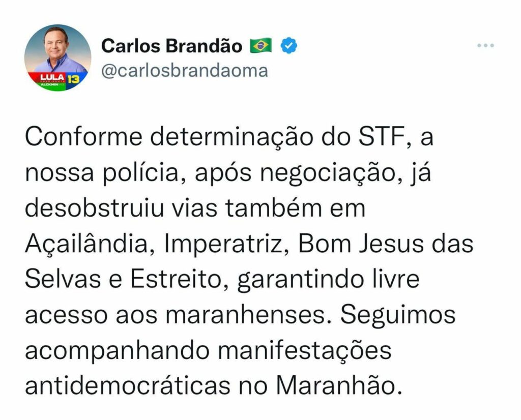 “Seguimos acompanhando manifestações antidemocráticas no Maranhão”, postou o chefe do executivo maranhense.
