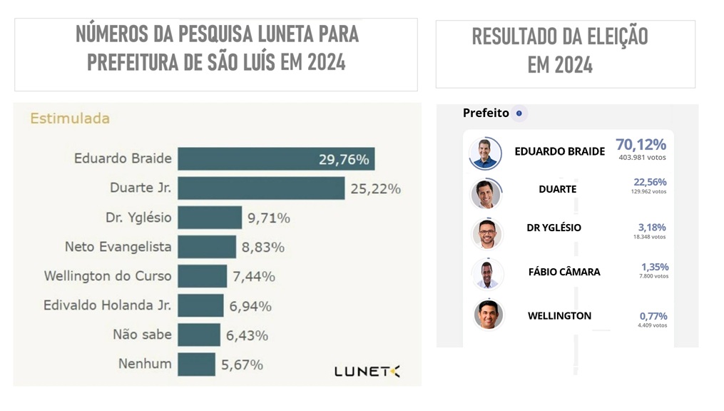 Em uma pesquisa publicada pela empresa Luneta, que ganhou o apelido de “lunática”, os números diziam que o prefeito Braide (PSD) estava empatado tecnicamente com Duarte Júnior (PSB), quando as urnas abriram, Braide obteve 70% contra 22% de Duarte.