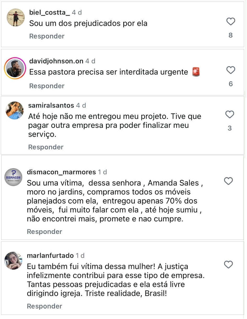 Amanda coleciona nada menos que 20 (vinte) processos judiciais pelo mesmo motivo: acusação de receber pagamentos de clientes [de 60% a 75% do valor] e não concluir a implantação de móveis projetados. Isso, sem contar as demais ações que estão em segredo de justiça pela mesma razão.