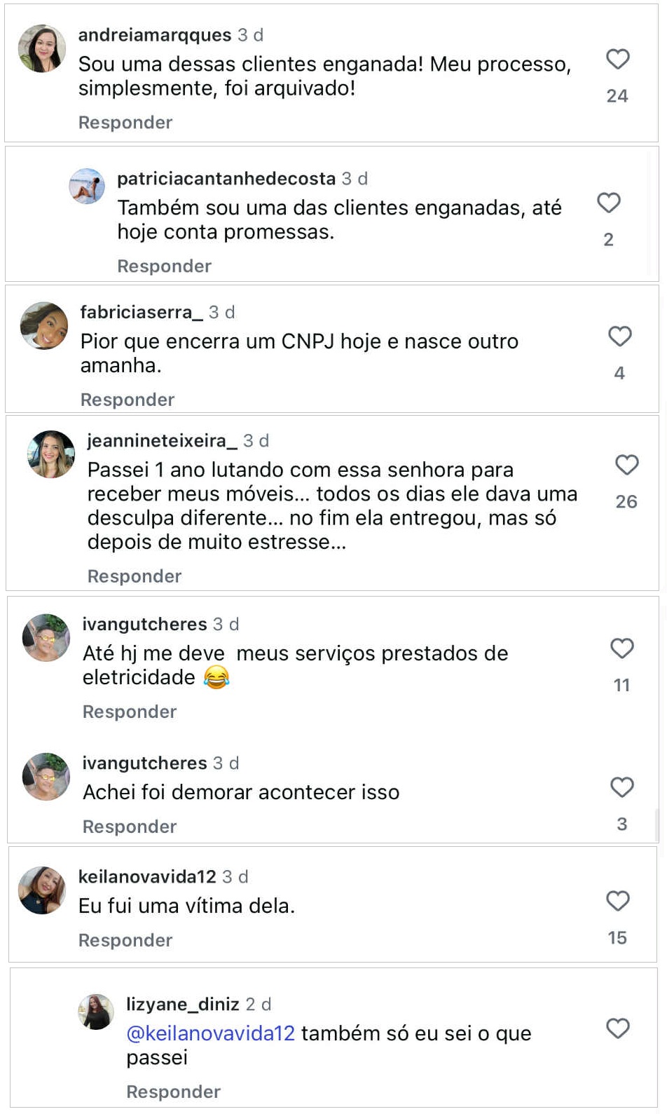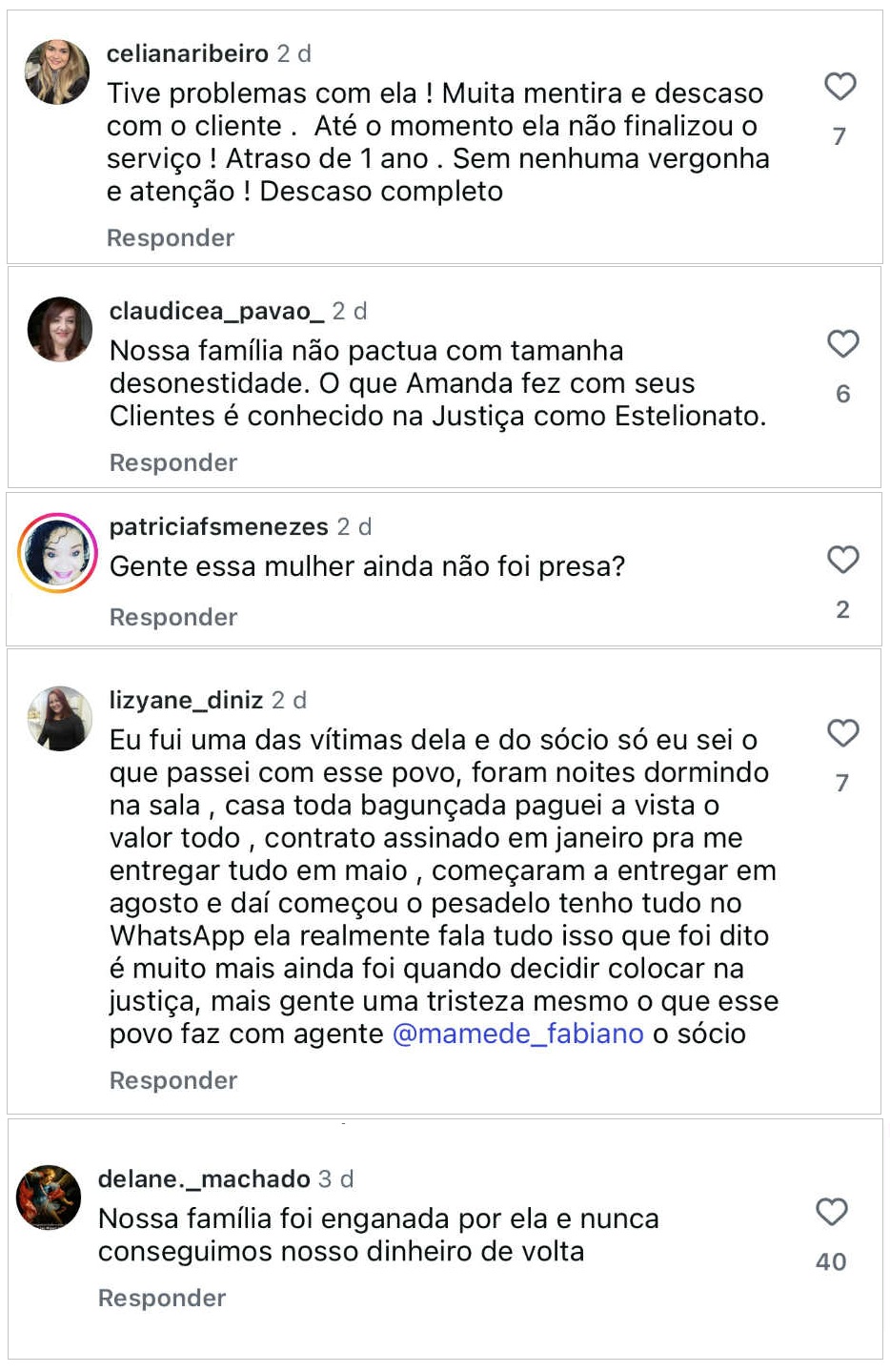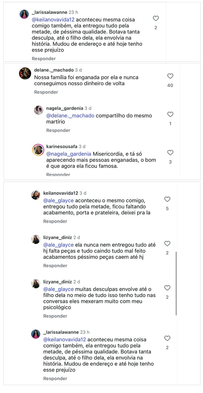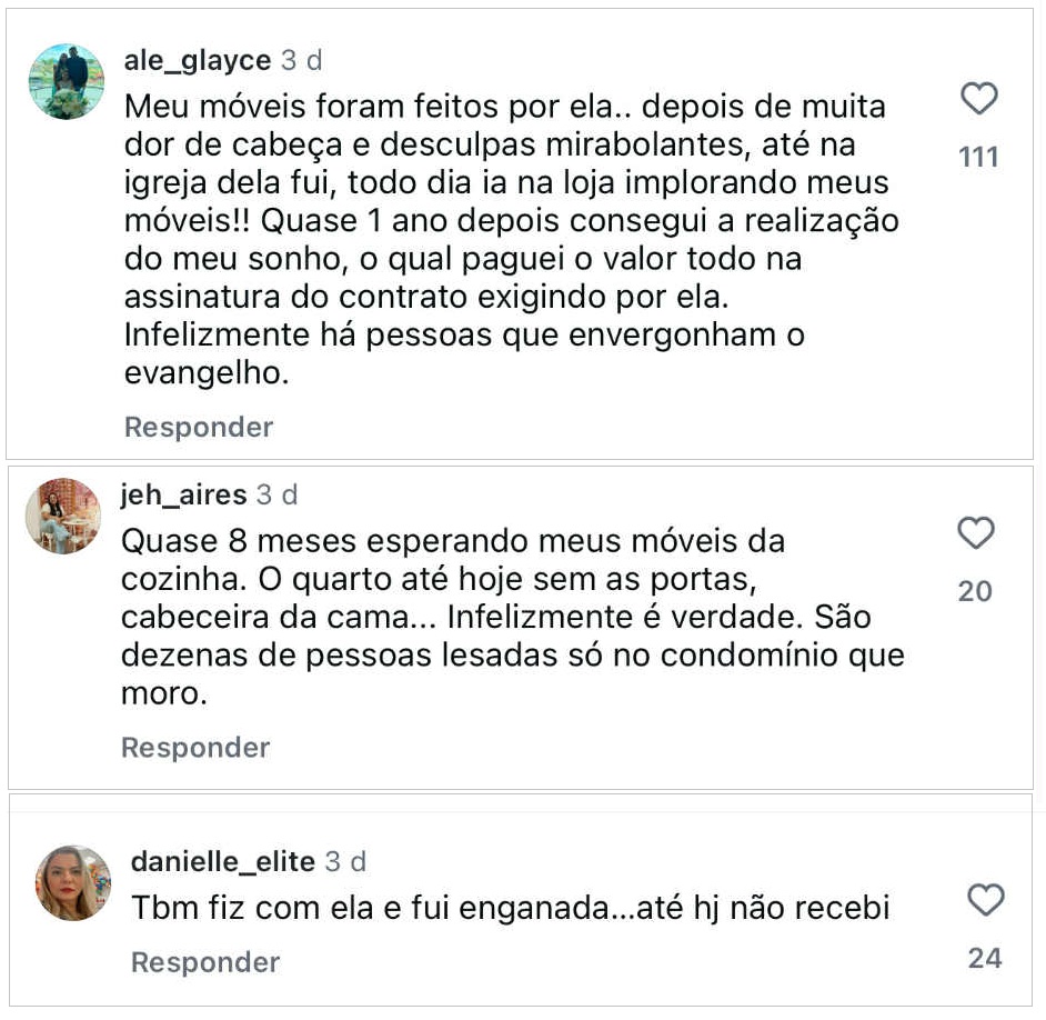 Nos comentários dessas postagens, somam centenas de vítimas que deixaram seus relatos de como foram enganadas e estão no prejuízo até hoje por conta da conduta de Amanda Porto. O Blog do DC fez uma seleção de pouco mais de 60 desses comentários.