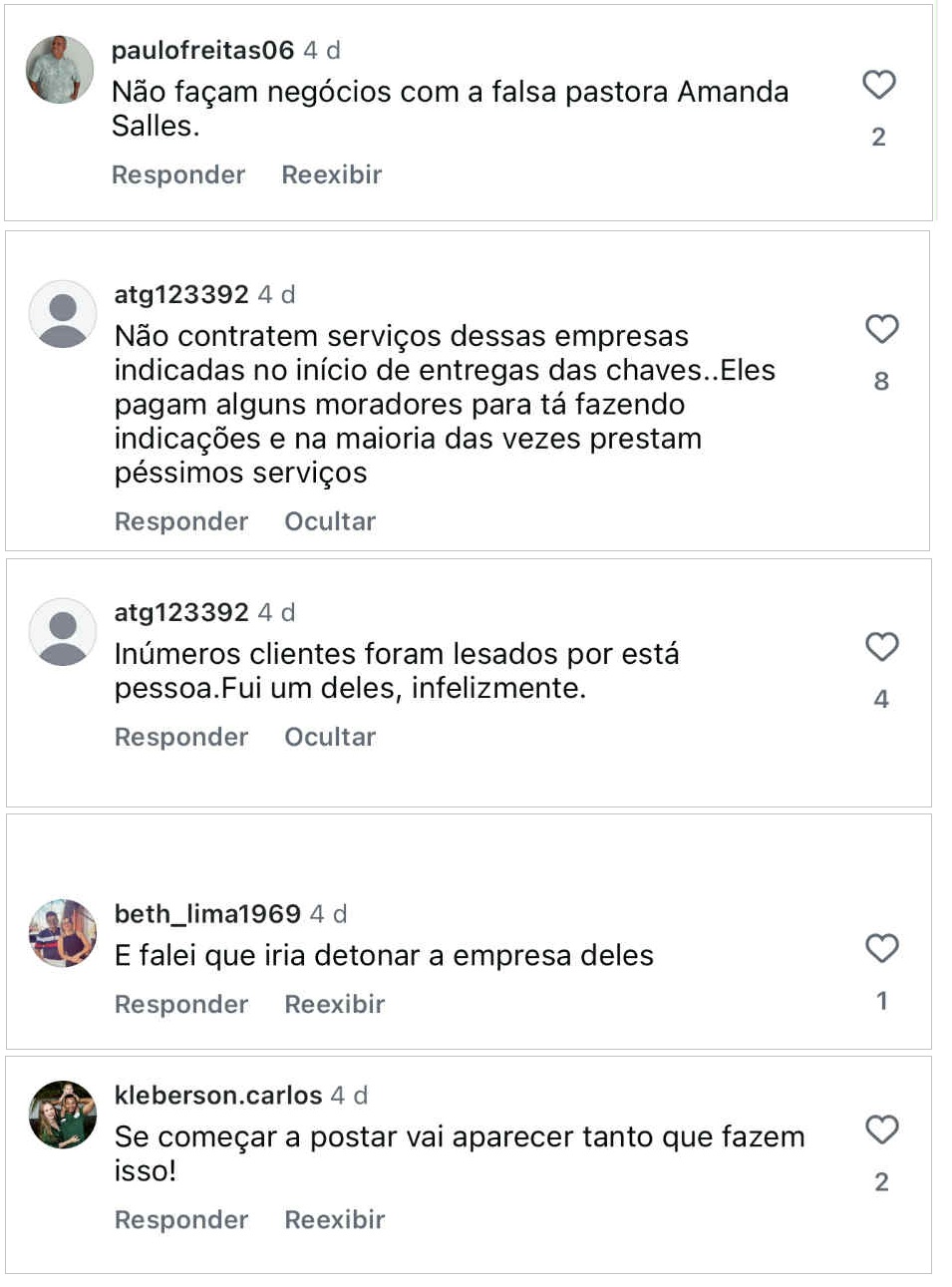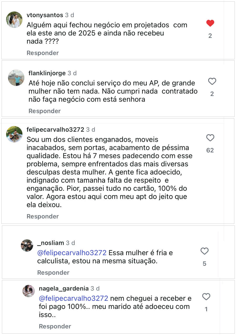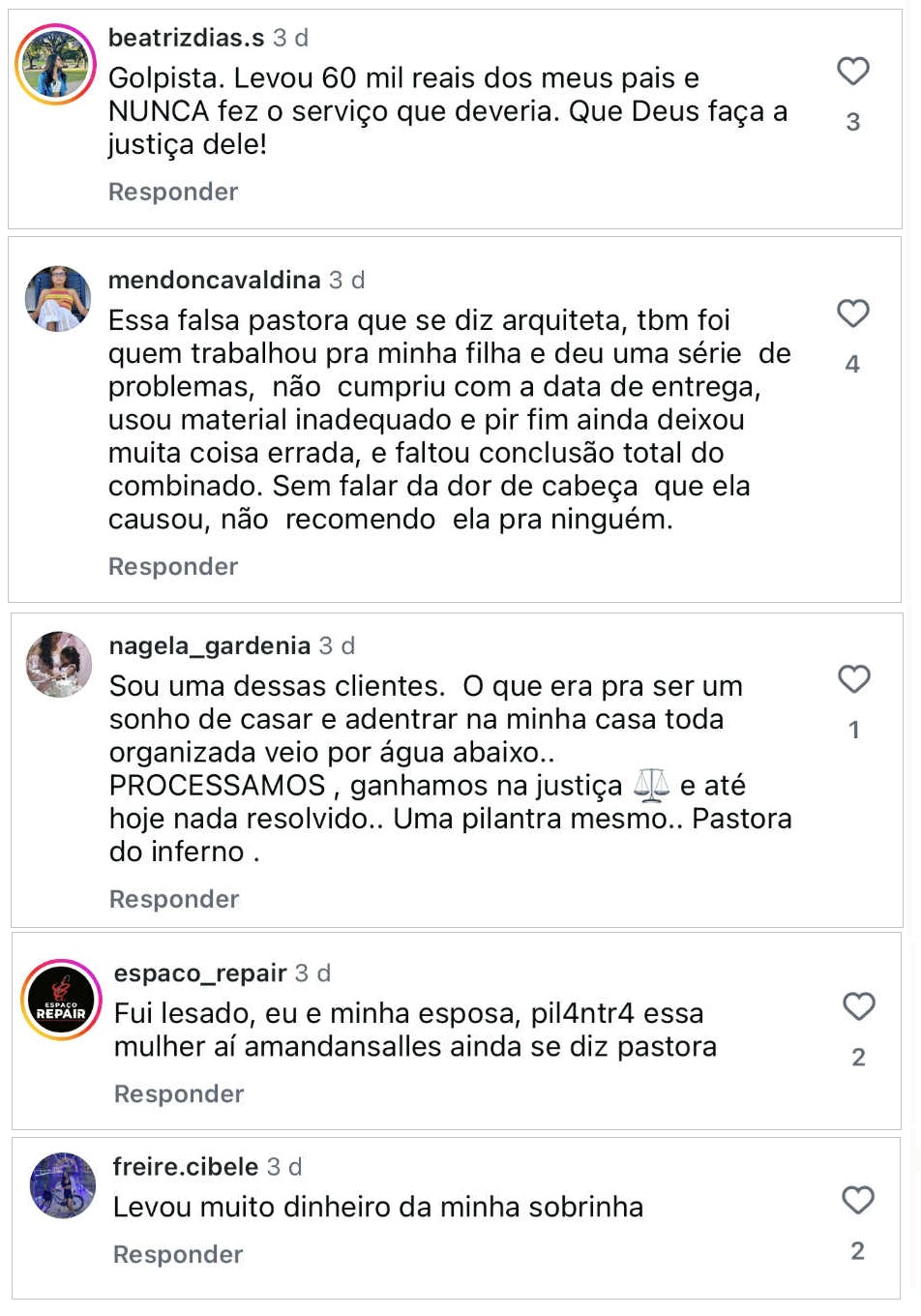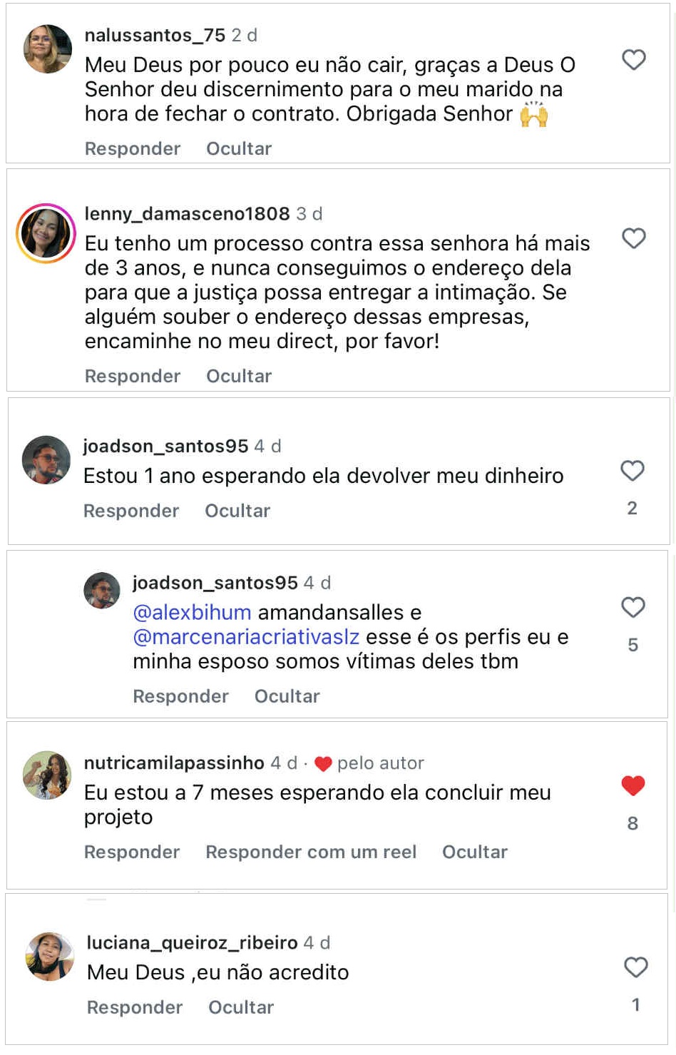 Nos comentários dessas postagens, somam centenas de vítimas que deixaram seus relatos de como foram enganadas e estão no prejuízo até hoje por conta da conduta de Amanda Porto. O Blog do DC fez uma seleção de pouco mais de 60 desses comentários.