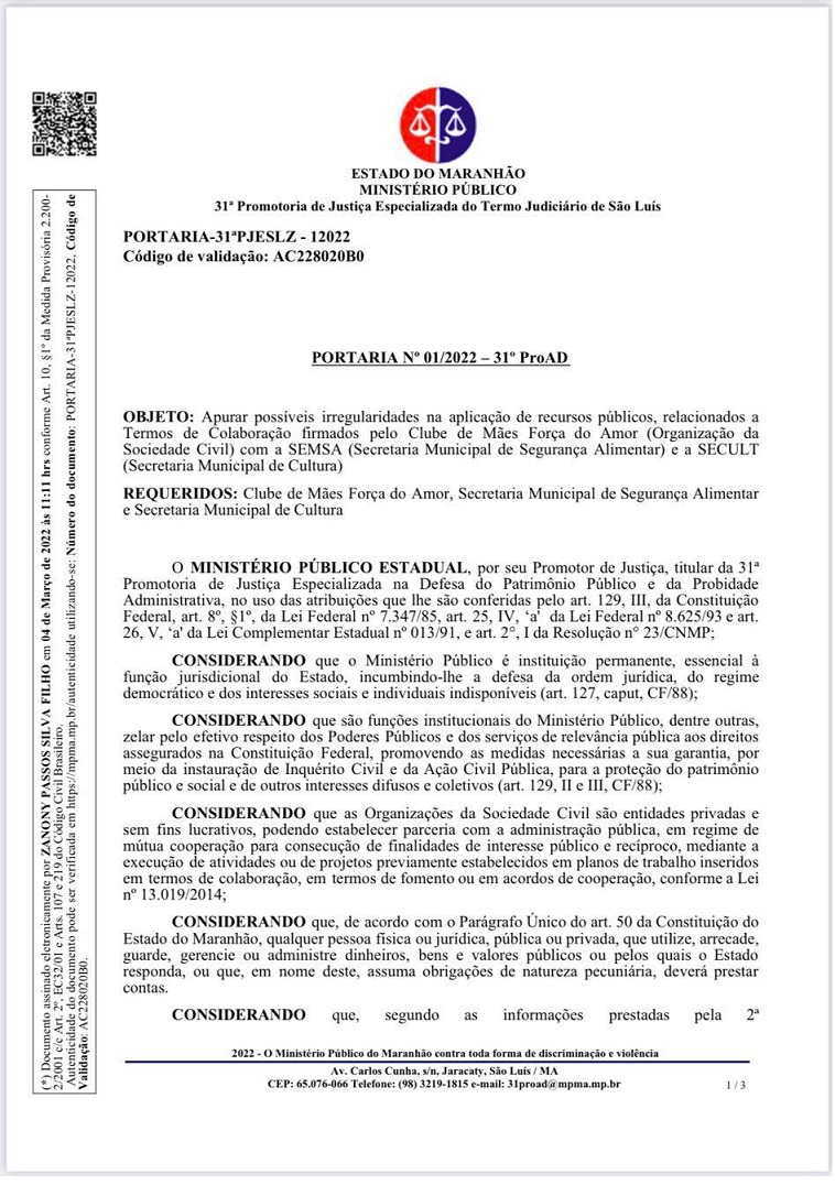 “Resolvo instaurar o presente Inquérito Civil tendente a apurar irregularidades na aplicação de recursos públicos pela Entidade Clube de Mães Força do Amor (Organização da Sociedade Civil), promovendo a necessária coleta de informações, depoimentos, certidões, perícias e demais diligências objetivando a propositura da ação civil ou eventual arquivamento do feito, se for o caso”, diz o promotor.