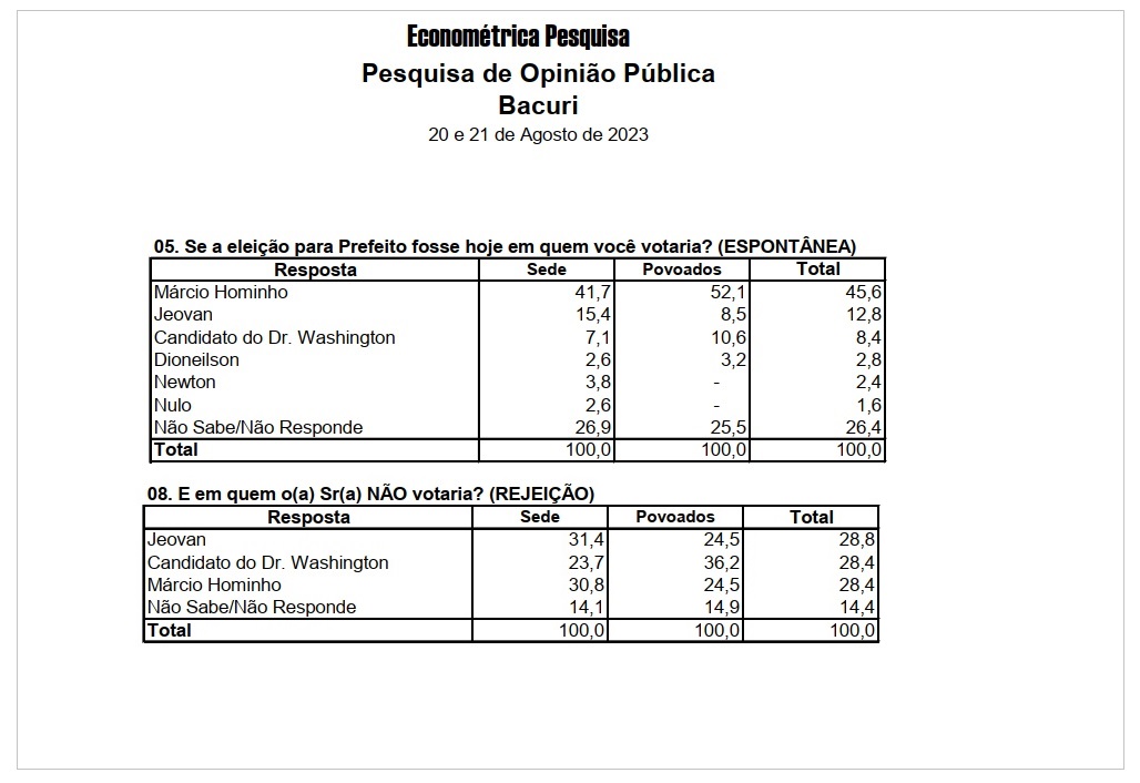 A Econométrica Pesquisas também quis saber quem é o pré-candidato mais rejeitado no município de Bacuri. Quando o Instituto perguntou em quem o entrevistado não votaria de jeito nenhum, o líder foi Jeovan com 28,8%, a opção “candidato do Dr. Washington obteve 28,4% e Márcio Hominho 28,4%; não sabem ou não responderam 14,4%.