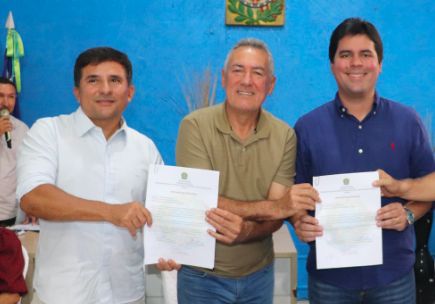 Fufuca e Carrinho Cidreira, no gabinete da Prefeitura de Viana, ao lado secretário nacional de Esporte Paulo Henrique, assinaram o instrumento de formalização referente a construção de quadra poliesportiva e instrumento de formalização referente ao Copão do Povo, maior competição esportiva do futebol amador na região.