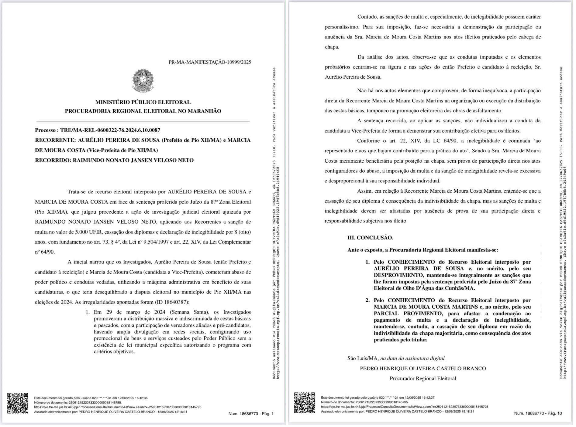 De acordo com o parecer assinado pelo procurador regional eleitoral Pedro Henrique Oliveira Castelo Branco, “a magnitude dos atos praticados, aliados à publicidade institucional utilizada como promoção pessoal, comprometeram a legitimidade e a normalidade das eleições municipais”. Com isso, o MPE opinou pelo desprovimento do recurso interposto por Aurélio, defendendo a manutenção da cassação, multa e declaração de inelegibilidade por oito anos.