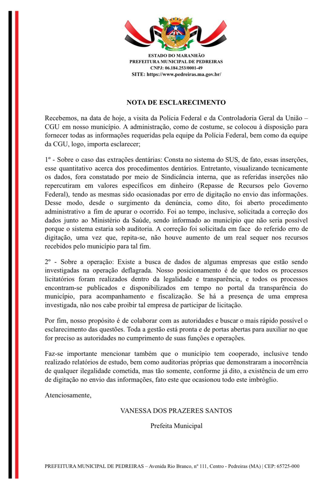 Por meio de nota, a prefeita do município de Pedreiras, Vanessa Maia, se pronunciou sobre a Operação TIRA-DENTE deflagrada na manhã desta quinta-feira (02) pela Polícia Federal é que investiga inserção de dados nos sistemas do SUS, visando à elevação do teto de repasses de recursos federais.