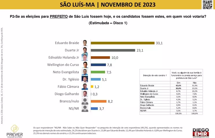 De acordo com o estudo, o prefeito Eduardo Braide (PSD) estagnou e aparece com 33,1%. Em segundo, o deputado federal Duarte Jr.(PSB) com 23,1%, uma diferença de dez apenas pontos percentuais. Em seguida figuram Edivaldo Holanda Júnior (10%), Wellington do Curso (7,8%), Neto Evangelista (7,5%), Dr. Ygléiso (5,1%), Fábio Câmara (1,2%), Diego Galhardo (0,3%). 8,2% brancos ou nulos e 3,7% não souberam ou não responderam.
