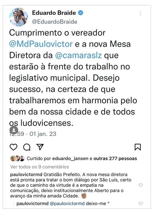 Por sua vez, na mesma publicação do prefeito, Paulo Victor deixou claro que aceita conversa com Braide apenas no campo institucional e descartou qualquer parceria política partidária.