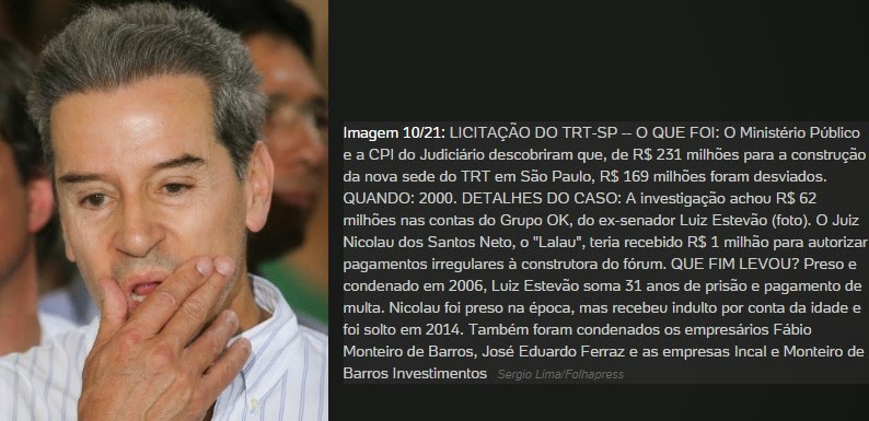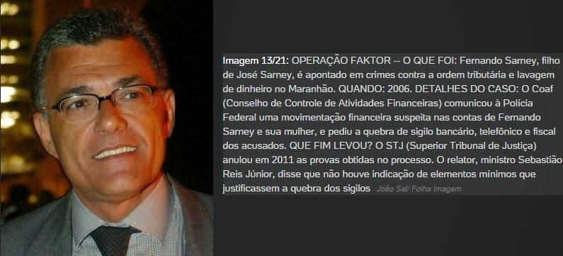 Infográfico do site UOL relembra os 21 maiores caos de corrupção que abalaram o país após a redemocratização. Entre esses casos estão listados os que envolvem a Fundação José Sarney e o empresário Fernando Sarney. A ‘Operação Faktor’ apontou o envolvimento do filho do senador Sarney em crimes contra a ordem tributária e lavagem de dinheiro no Maranhão. Já a Fundação José Sarney foi envolvida em um esquema de desvio de R$ 500 mil de recursos da Petrobrás que se destinavam a patrocinar um projeto cultural. O dinheiro foi desviado para empresas fantasma e empresas da família do senador Sarney. Veja abaixo a listagem dos principais casos de corrupção depois da redemocratização do Brasil.
