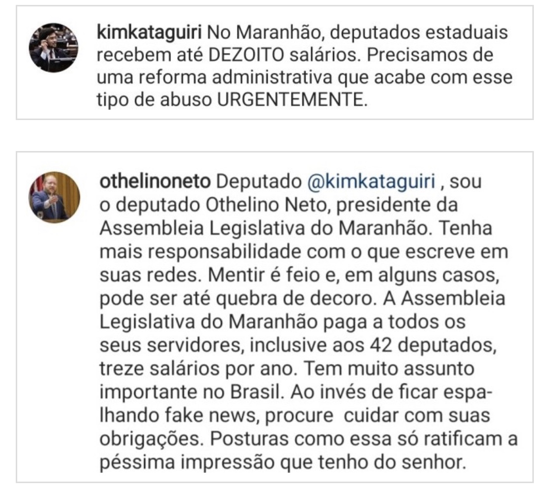 O deputado estadual Othelino Neto (PC do B), presidente da Assembleia Legislativa do Maranhão, utilizou suas redes sociais neste fim de semana para desfazer informação falsa divulgada pelo deputado federal Kim Kataguiri, do Democratas de São Paulo.