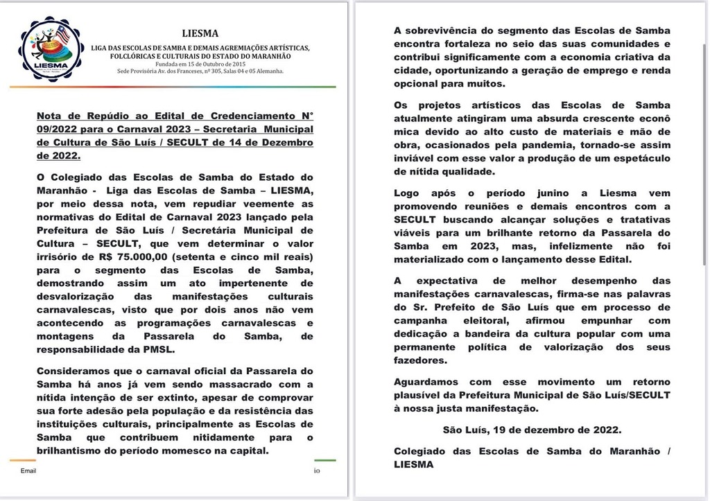 A Liga das Escolas de Samba – LIESMA emitiu nesta segunda-feira (19) uma nota de repúdio contra a gestão do prefeito Eduardo Braide (PSD) após a secretaria municipal de Cultura estipular apenas R$ 75.000,00 (setenta e cinco mil reais) para cada uma das Escolas de Samba que desfilarão no Carnaval da Passarela do Samba em 2023.