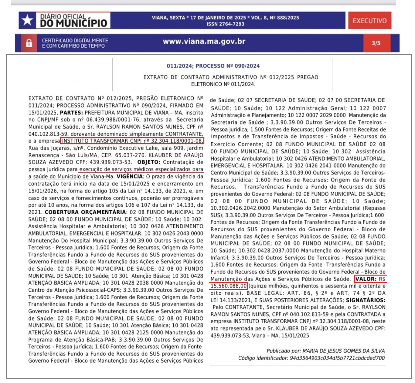 O prefeito Carrinho Cidreira, do PL, pretende gastar a expressiva quantia de R$ 15.560.088,00 (quinze milhões, quinhentos e sessenta mil e oitenta e oito centavos) com o Instituto Transformar, localizado na Rua das Juçaras, sem número, Condomínio Executive Lake Center, Sala 909, V Garage117, bairro Jardim Renascença, em São Luís.