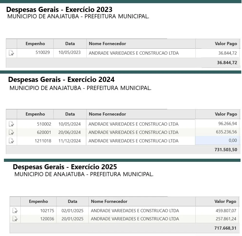 Esse dinheiro foi transferido para a conta da empresa através de seis pagamentos diferentes, nos anos de 2023, 2024 e 2025, mediante os comprovantes de datas e valores abaixo. Os contratos com a prefeitura de Anajatuba são assinados pelo sócio da empresa, Joscimar Andrade Prazeres.