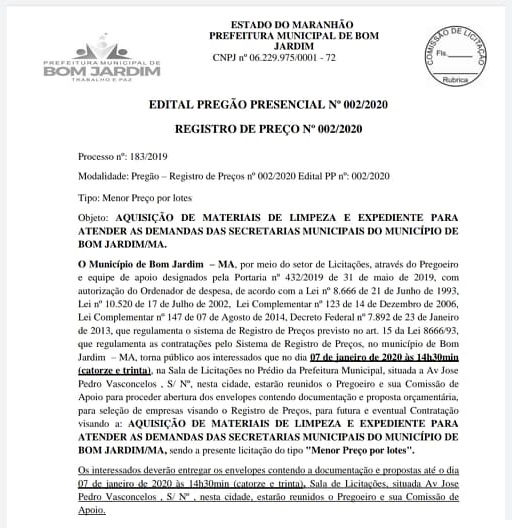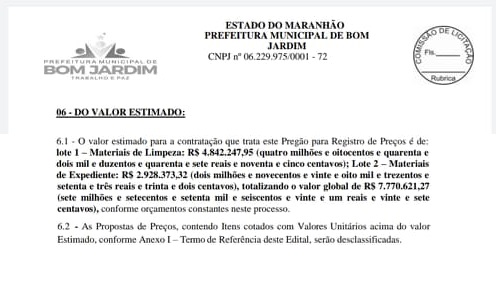 O Blog do Domingos Costa teve acesso ao Edital Pregão Presencial nº 002/2020 no qual a prefeitura busca por meio de registro de preço gastar nada menos que R$ 7.770.621,27 (sete milhões e setecentos e setenta mil e seiscentos e vinte e um reais e vinte e sete centavos) com material de limpeza e expediente.