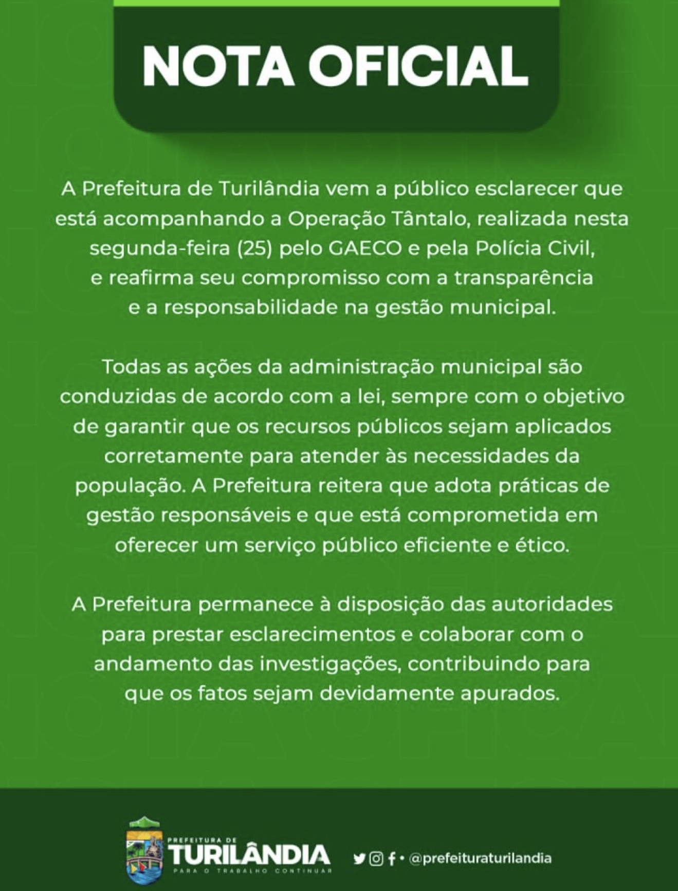 A prefeitura de Turilândia, por meio de nota publicada nesta terça-feira (25), se colocou a disposição das autoridades no que diz respeito a Operação Tântalo, realizadapelo Grupo de Atuação Especial de Combate às Organizações Criminosas (Gaeco) do Ministério Público do Estado do Maranhão, resultou na apreensão de 10 veículos, documentos e equipamentos. Também foram apreendidas armas de fogo e realizadas sete prisões em flagrante por posse e porte ilegal desse armamento.