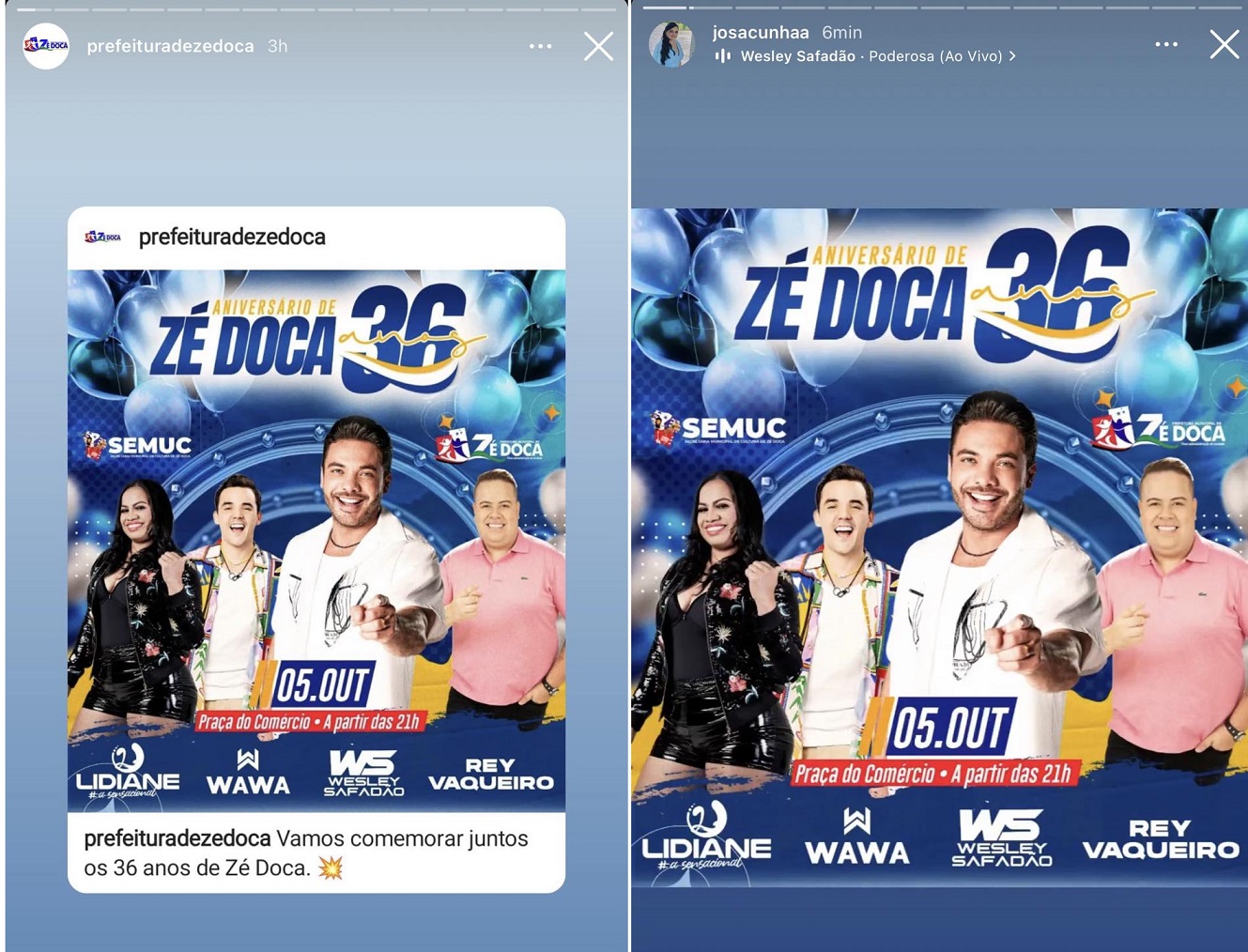 Nesta terça-feira (26), por exemplo, as contas da prefeitura de Zé Doca e, também da chefe do Executivo municipal, divulgaram um flyer (panfleto eletrônico) no qual confirmam que irão realizar o show de aniversário dos 36 anos da cidade na Praça do Comércio, a partir das 21h.
