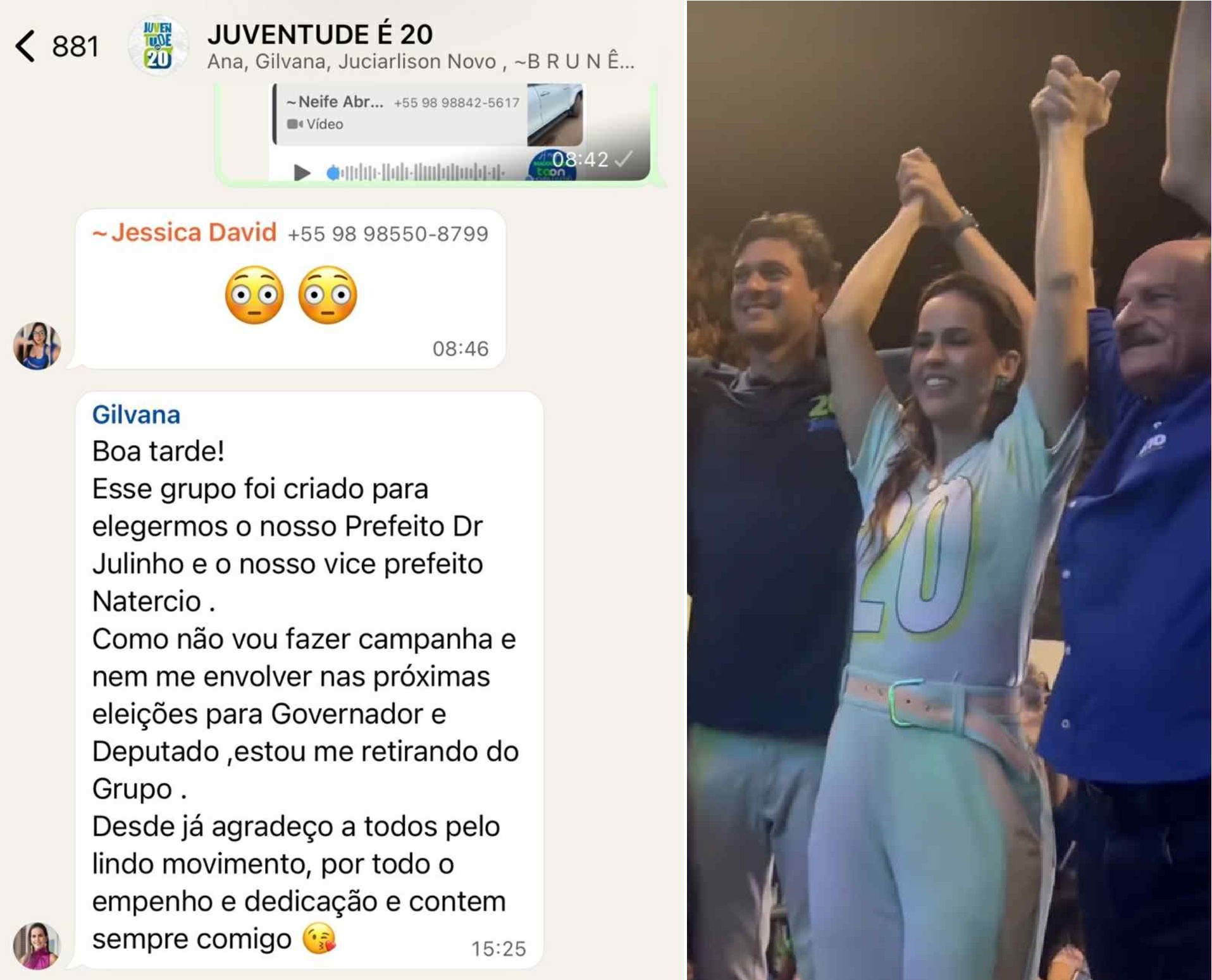 Na tarde desta terça-feira (05), em grupo de WhatsApp o qual fazem parte membros da prefeitura de São José de Ribamar, a primeira-dama da cidade, Gilvana Duailibe, declarou que não apoiará os candidatos a deputado estadual, federal e a governador do grupo político do próprio marido, o prefeito, Dr Julinho (Podemos).