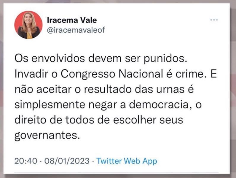 A deputada estadual Iracema Vale (PSB) usou suas redes sociais na noite deste domingo (08) para criticar veementemente os atos terroristas praticados por bolsonaistas em Brasília, neste domingo (8), contra o Congresso Nacional, o Palácio do Planalto e o Supremo Tribunal Federal.