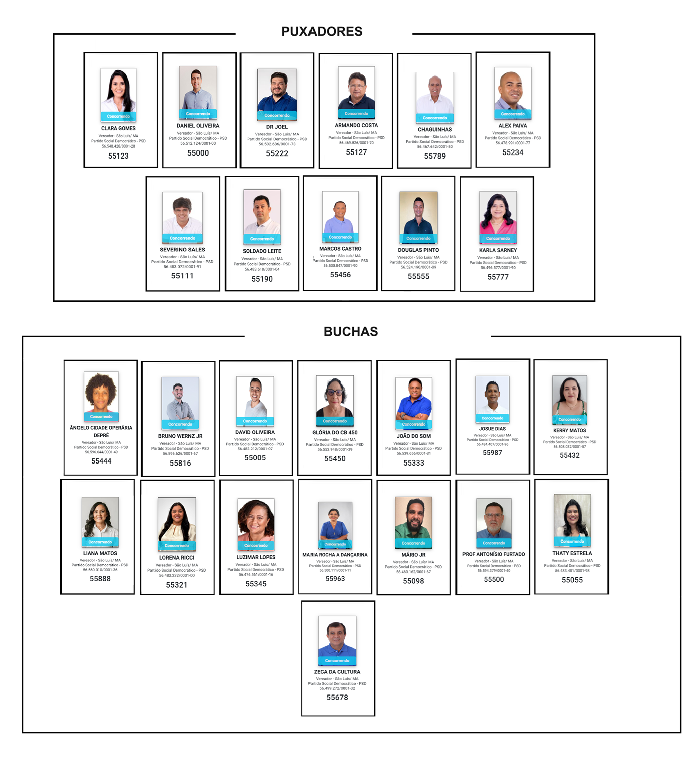 Os 11 puxadores de votos possuem, em tese, algo em torno de 45 mil votos. A esse número somam-se mais cerca de 13 mil votos que todos os “buchas” devem conquistar nas urnas e mais 10 mil votos de legenda de Braide. De forma que o PSD deve alcançar aproximadamente 68 mil votos.